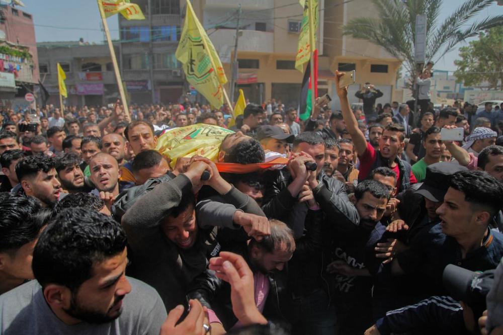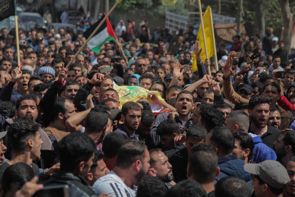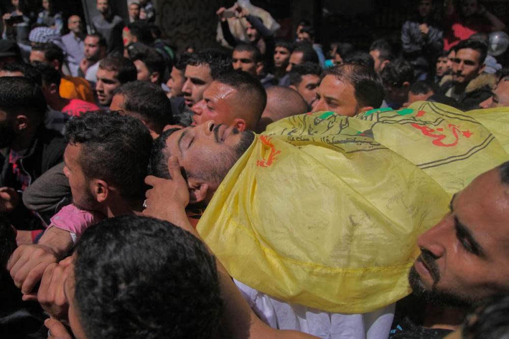 شيع الفلسطينيون جثمان الشهيد ثائر رابعة، والذي استشهد متأثرا بجراحه التي أصيب بها خلال مواجهات مع قوات الاحتلال الإسرائيلي اليوم في مخيم جباليا شمال قطاع غزة.