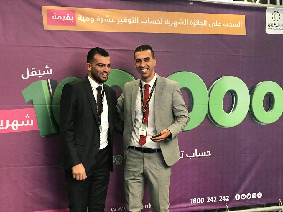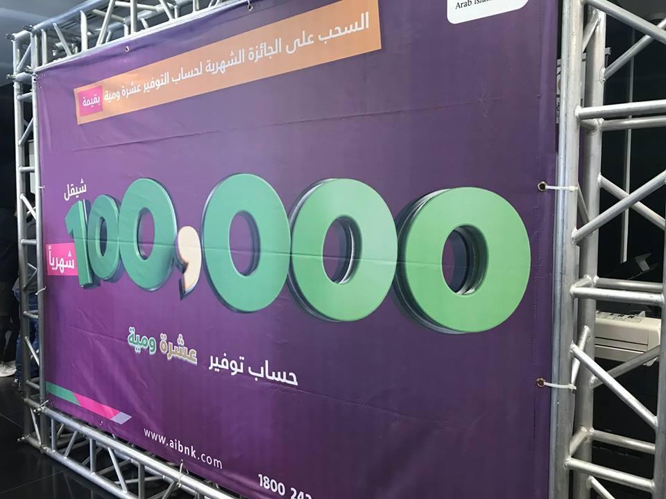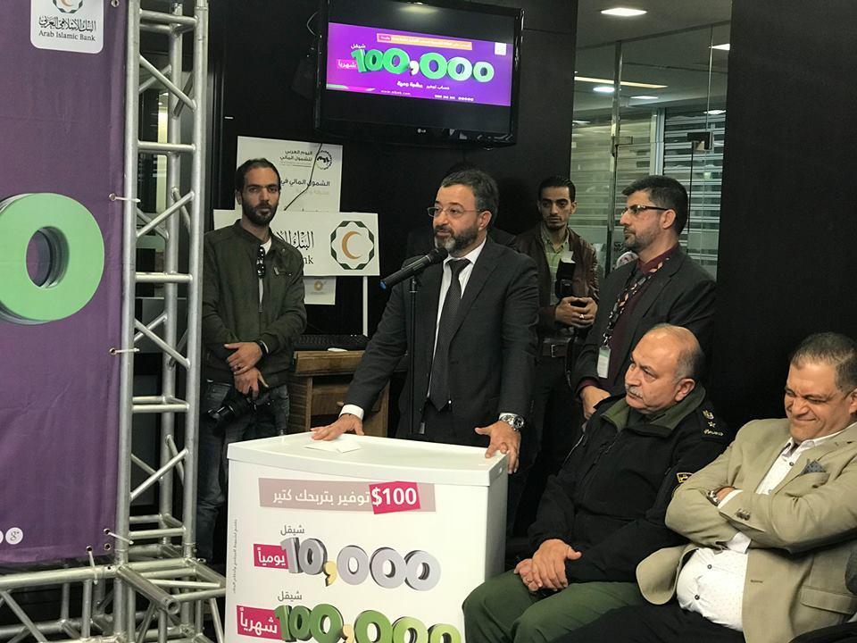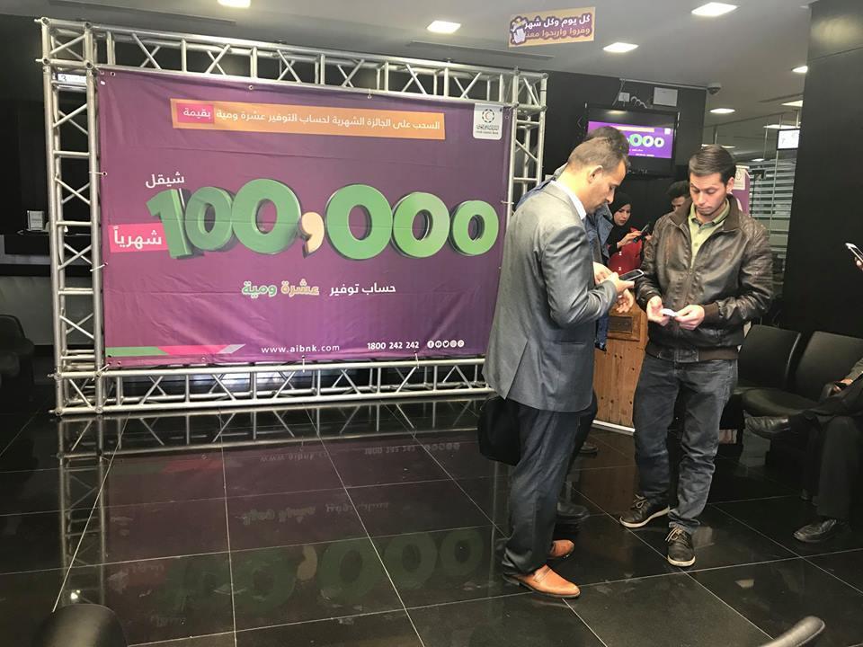 البنك الاسلامي العربي فرع قلقيلية يجري السحب على الجائز الشهرية الرابعة بقيمة 100 الف شيكل لحملة حساب التوفير الجديد "عشرة ومية"، والذي يمكن فتحه بمبلغ 100 دولار فقط ليمكن صاحبه من الدخول على سحب يومي بقيمة 10 الاف شيكل و سحب شهري على 100 الف شيكل، حيث بدأ السحب اليومي بتاريخ 1/8/2018 ، و هذا رابع سحب على الجائزة الشهرية بقيمة 100 الف شيكل.