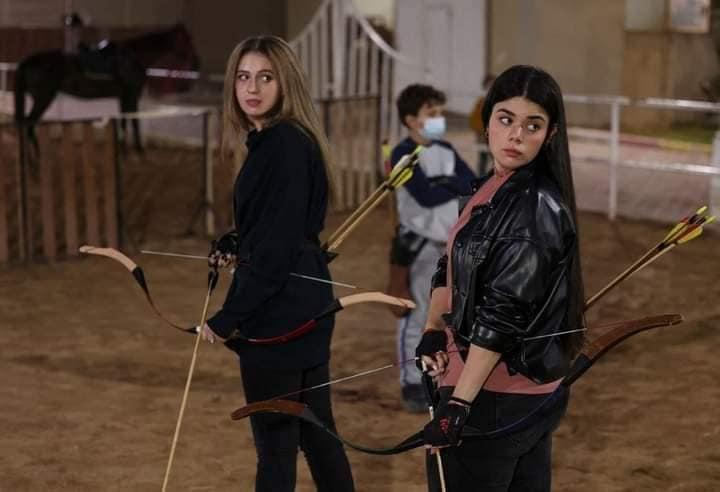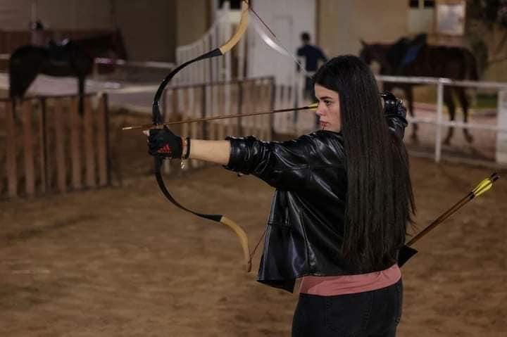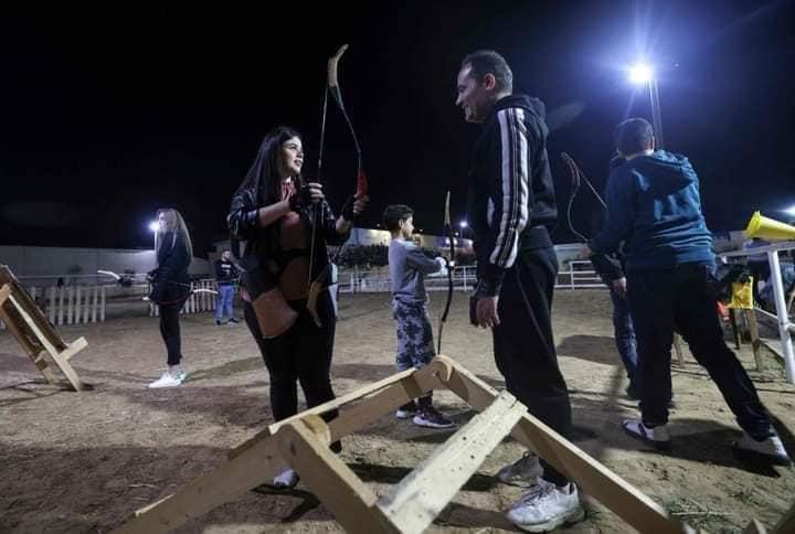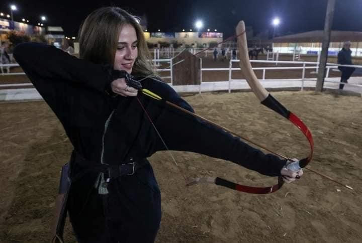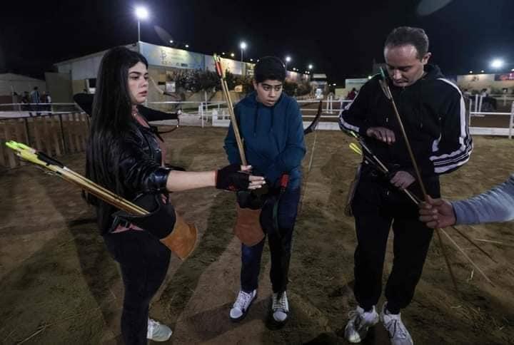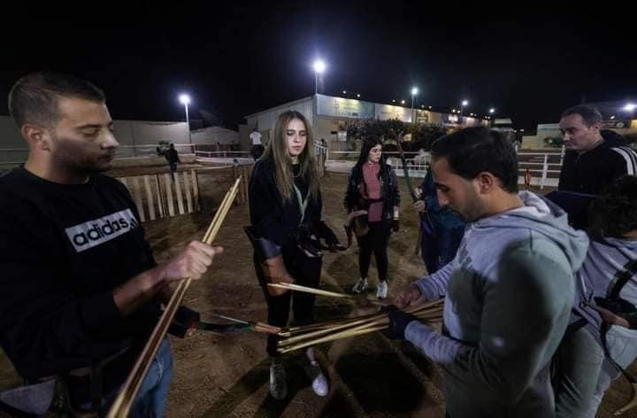 شبان وفتيات يتدربون على رمي السهام المصنوعة يدويًا داخل نادي الأصدقاء للفروسية بغزة.