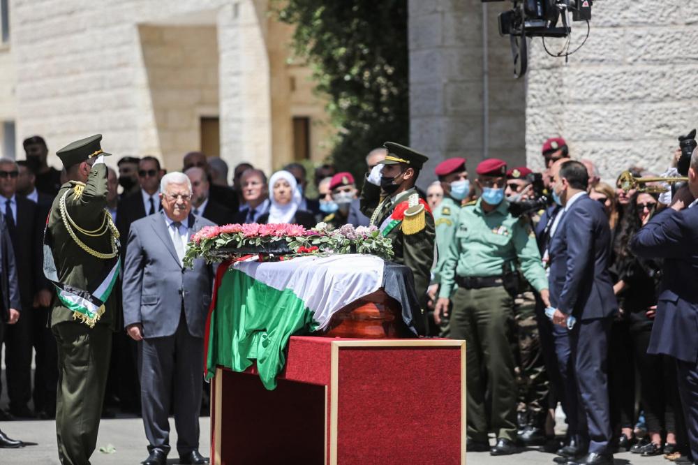 ووضع الرئيس إكليلا من الزهور على جثمان الشهيدة أبو عاقلة، والقى نظرة الوداع الأخيرة على جثمانها، الذي لف بالعلم الفلسطيني، لدى وصوله إلى مقر الرئاسة، قبل أن ينقل إلى المستشفى الفرنسي في مدينة القدس، حيث سيوارى الثرى هناك يوم غد الجمعة.