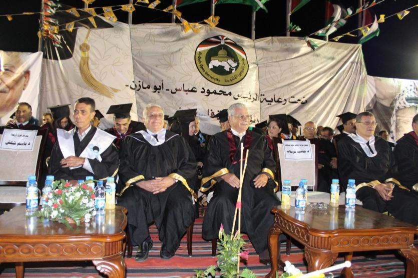 احتفلت جامعة القدس المفتوحة، امس الاثنين، بتخريج الفوج السادس عشر "فوج البناء والارتقاء"، في فرع أريحا، بحضور ممثل الرئيس محمود عباس الدكتور صائب عريقات رئيس دائرة شؤون المفاوضات في منظمة التحرير وأعضاء الهيئتين الأكاديمية والإدارية، وعلى رأسهم المهندس عدنان سمارة رئيس مجلس الأمناء، وأ. د. يونس عمرو رئيس الجامعة، ونواب رئيس الجامعة ومساعدوه ومدراء الفروع، وفي مقدمتهم مدير فرع أريحا. د. باسم شلش، وعدد من الشخصيات الرسمية والاعتبارية على رأسهم محافظ أريحا والأغوار العميد ماجد الفتياني، وأهالي الخريجين.