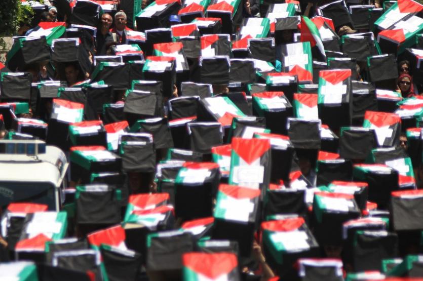 الفلسطينيون يسلمون 500 نعش شهيد رمزي الى مقر الامم المتحدة في رام الله