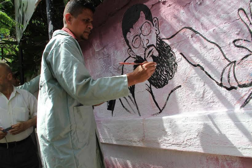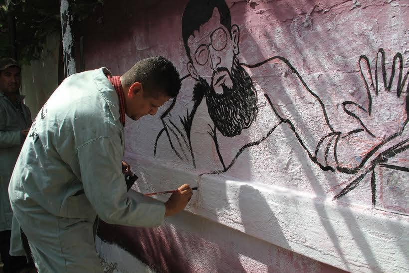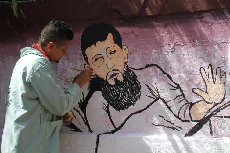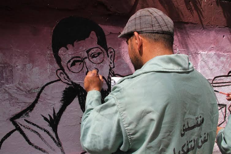 رسم حي لجدارية تضامنية لخضر عدنان في اعتصام ذوي أسرى غزة
