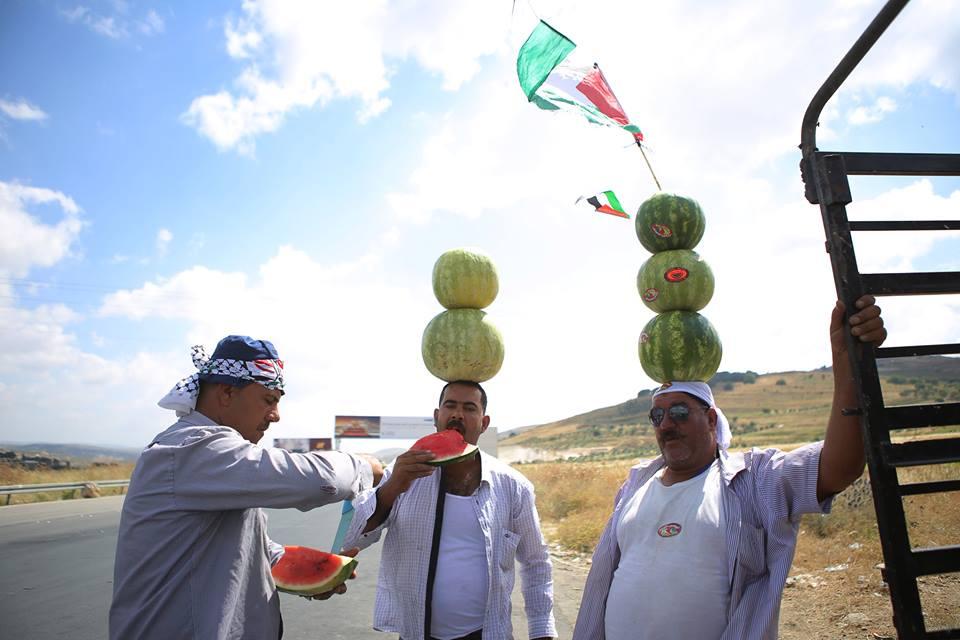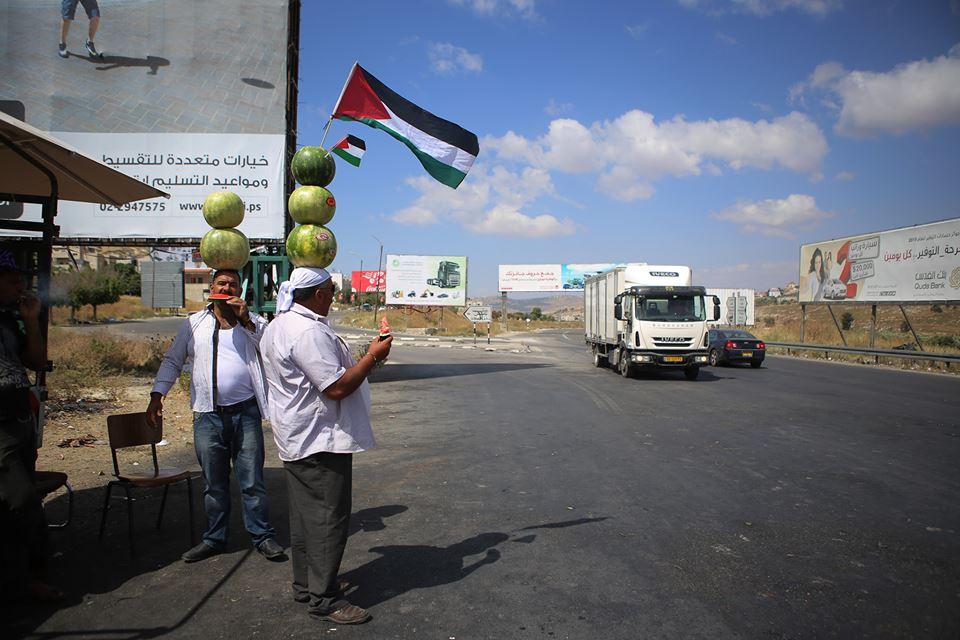 بائع البطيخ أبو حلوم من مخيم بلاطة يوازن البطيخ على رأسه في محاولة لجذب الزبائن في الطريق بين نابلس ورام الله.