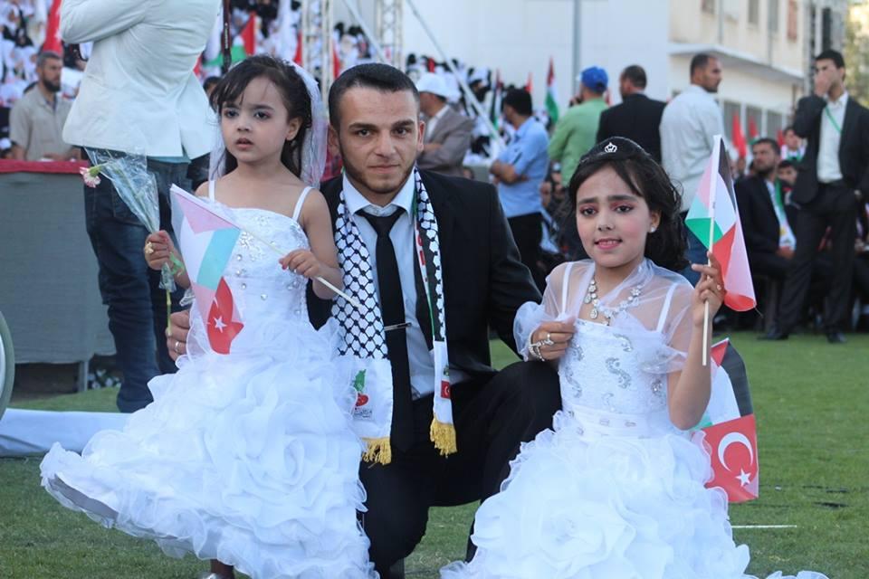 زف 4000 عريس وعروس عصر اليوم الأحد، في حفل زفافي جماعي في مدينة غزة بتمويل من وزارة الشئون الدينية التركية ووكالة التنسيق والتعاون التركي "تيكا" التركية الحكومية، حيث انطلقت زفة العرسان من أرض السرايا باتجاه ملعب اليرموك، إضافة إلى مواكب لزفاف عرسان منطقتي الوسطى والجنوب في قطاع غزة، ورفعت اعلام فلسطين وتركيا وصور للرئيس التركي رجب طيب أردوغان، بحضور وزراء حكومة التوافق في غزة، وممثلين عن الفصائل بغزة، وتخلل الحفل فقرات فنية وتراثية.