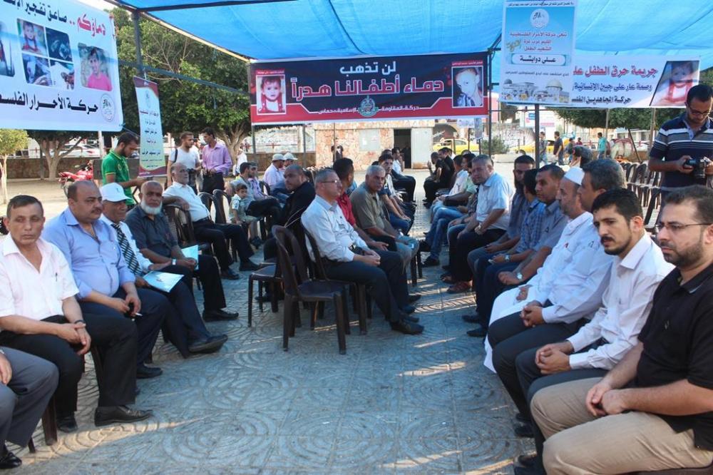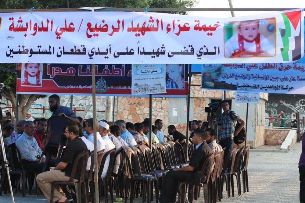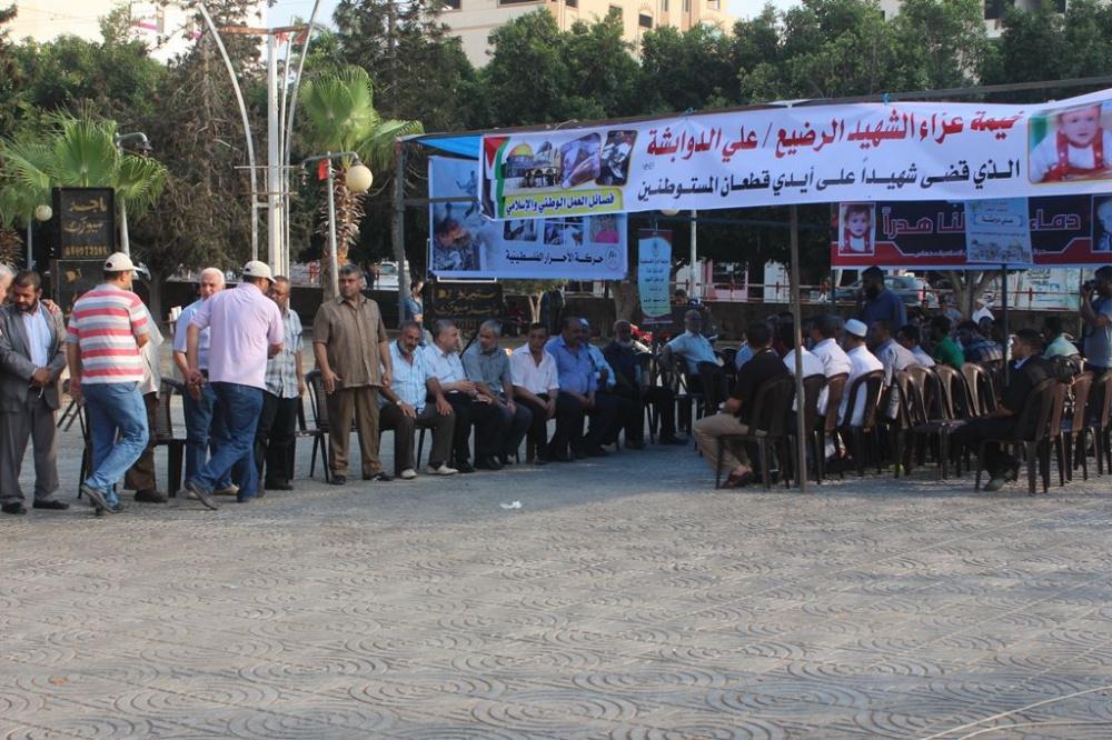 غزة - راية عدسة: سامح أبو دية أقامت القوى الوطنية والاسلامية في قطاع غزة خيمة عزاء رمزية لشهيد محرقة دوما الرضيع "علي الدوابشة" في ساحة الجندي المجهول وسط مدينة غزة، بحضور شخصيات اعتبارية وممثلين عن الفصائل الوطنية.