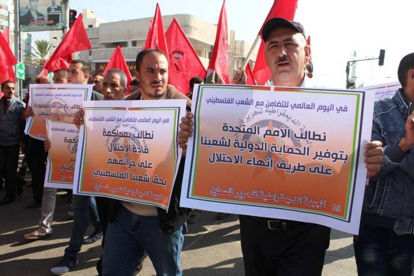 شاركت الفصائل الفلسطينية بقطاع غزة في مسيرة ووقفة في اليوم العالمي للتضامن مع الشعب الفلسطيني الذي يصادف اليوم الأحد، دعت لها الجبهة الديمقراطية، حيث دعا المشاركون في المسيرة الى انهاء الانقسام وتطوير الهبة الشعبية في الضفة والقدس الى انتفاضة جماهيرية، وتجسيد دولة فلسطينية مستقلة وعاصمتها القدس الشريف.