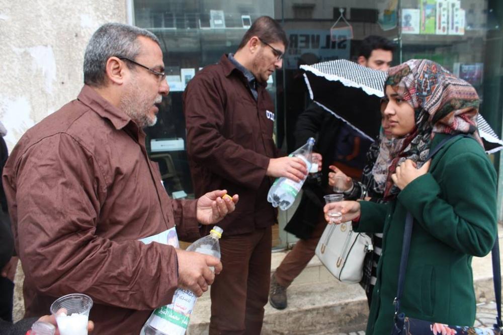 أطلقت جمعية واعد للأسرى والمحررين بغزة مساء اليوم الأربعاء، حملة توزيع "طعام الحرية مي وملح" لتوعية المواطنين والتضامن مع الأسير المضرب عن الطعام محمد القيق، سبقها وقفة تضامنية بحضور أسرى محررين، حيث ارتدى المشاركون ملابس الأسرى في سجون الاحتلال وقاموا بتوزيع الماء والملح على المواطنين.