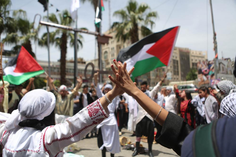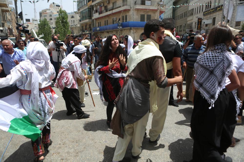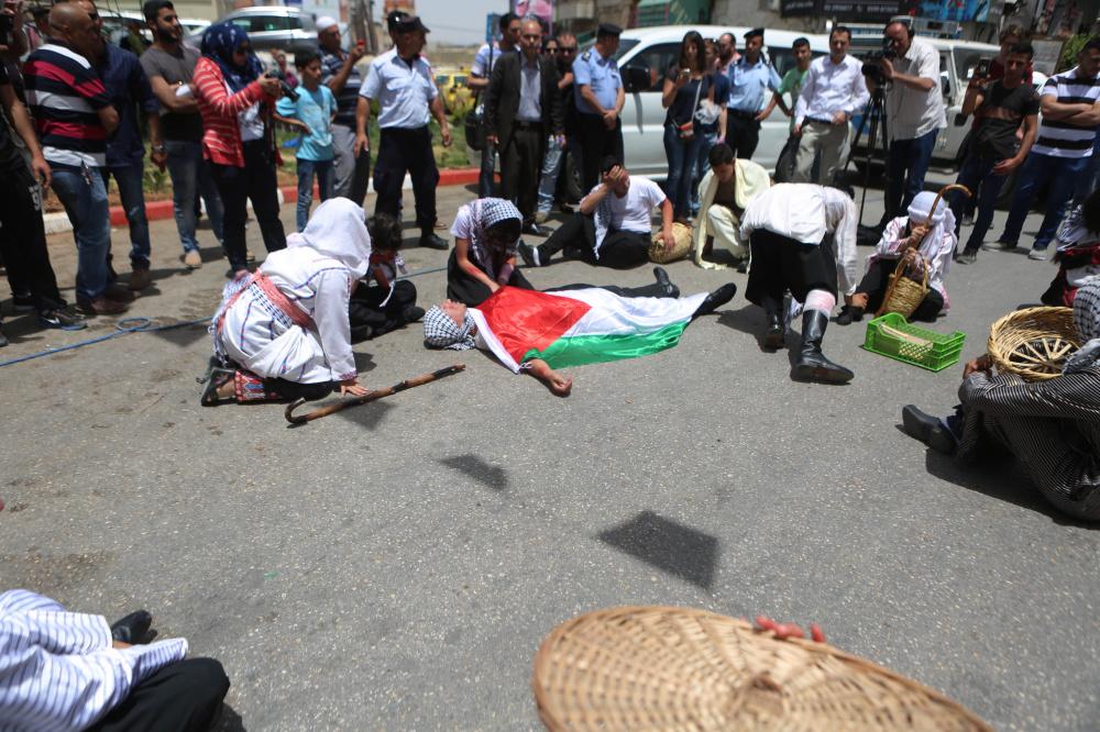 إعادة تمثيل مشهد من النكبة عام 1948 خلال مسيرة بمناسبة ذكرى النكبة في مدينة رام الله