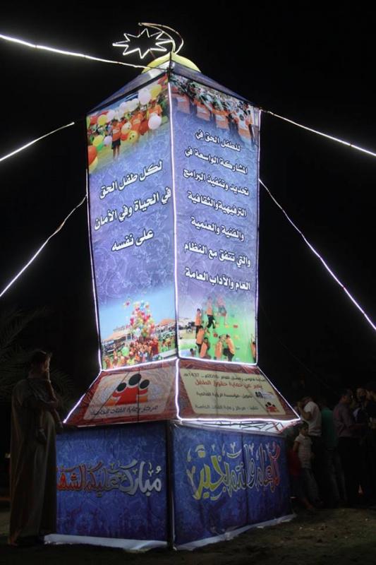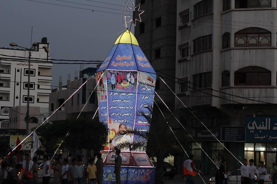 غزة - راية تصوير: سامح أبو دية أنار مركز رعاية الفئات الخاصة بغزة بتمويل من الرؤية العالمية مساء اليوم الأحد، أكبر فانوس في قطاع غزة يُعبر عن حقوق الطفل، حيث تم اضائة فانوس رمضان الضخم على مفترق الصفطاوي الذي يربط شمال قطاع غزة بمدينة غزة،
