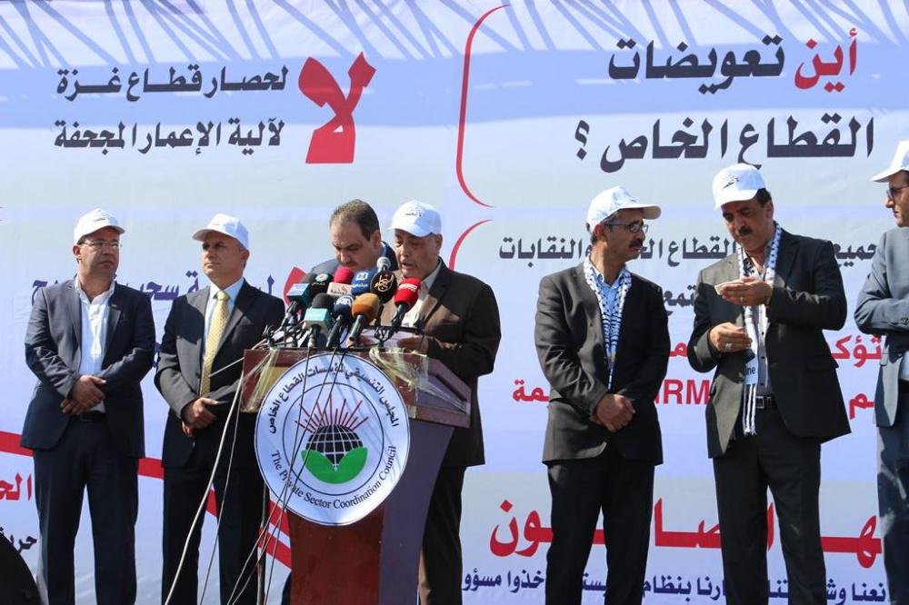 نظم القطاع الخاص من رجال أعمال وتجار وأصحاب مصانعة متضررة، وقفة احتجاجية كبيرة في ساحة الكتيبة غرب مدينة غزة، ضد قرارات الاحتلال التي تستهدفهم، حيث ندد المشاركون بإجراءات الاحتلال الإسرائيلي التعسفية ضد القطاعات الحيوية، والمتمثلة بوقف إدخال الإسمنت والمواد الخام، وشل حركة التجارة والانتاج في غزة.