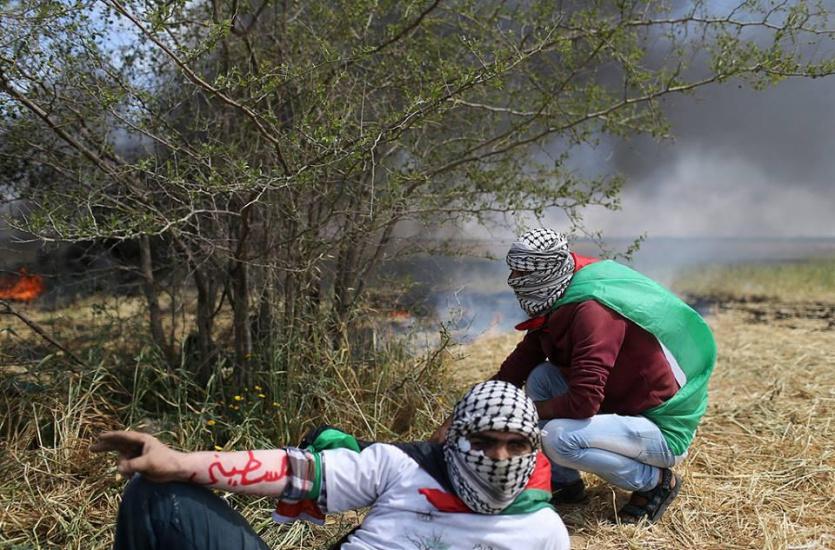 وأشعل المتظاهرون النيران في إطارات السيارات على طول الحدود مستخدمين مرايا عاكسة لتشويش رؤية قناصة الاحتلال.