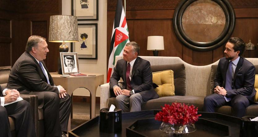 بحث العاهل الاردني عبدالله الثاني مع وزير الخارجية الأمريكي مايك بومبيو، في واشنطن، مساعي تحريك عملية السلام، حيث جدد العاهل الاردني تأكيده على ضرورة تكثيف الجهود المستهدفة إعادة إطلاق مفاوضات جادة فاعلة بين الفلسطينيين والإسرائيليين استنادا إلى حل الدولتين وبما يفضي إلى إقامة الدولة الفلسطينية وعاصمتها القدس الشرقية.