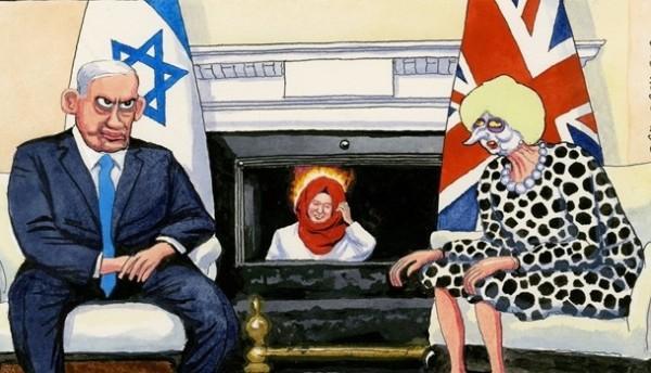 ويصور الرسم تيريزا ماي وبنيامين نتنياهو يجلسان أمام موقد تحرق فيه النجار.