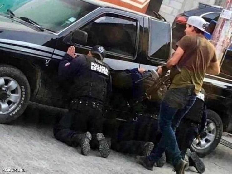 في مشهد غريب من نوعه، ومعاكس للأدوار المنطقية في الشارع، ألقى أفراد عصابة في المكسيك القبض على عناصر من الشرطة وأجبروهم على الركوع، وفق ما أظهرت صور التقطها مشاة عاديون مروا بالقرب من موقع الحادثة.