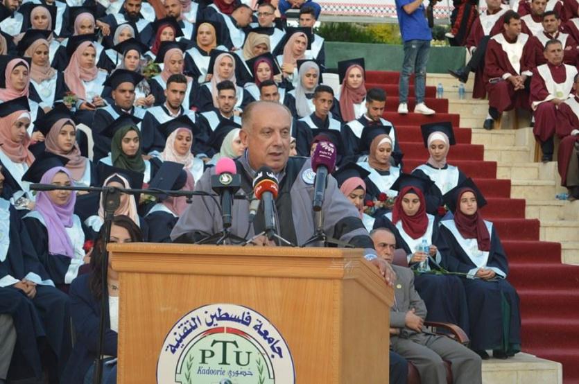 وأضاف: "بقيادة رئيسنا الحكيم وتوجيهات رئيس الوزراء الأمين، فإن التاريخ سيسجل صمودكم أمام هذه الحرب الاقتصادية الشرسة، التي تشن علينا، ورسالتنا إلى العالم كله ان فلسطين ستبقى خضراء بكرمها وتاريخها وماضيها العريق وحاضرها، وأن هذا الصرح العلمي خير برهان، ولد في ظل الانتداب البريطاني كمدرسة زراعية، وهب الكرميون لتأسيسها حفاظا على الهوية الوطنية والقومية، وتطور في العهد الأردني، وانتهى كجامعة فلسطينية تقنية يشار اليها بالبنان".