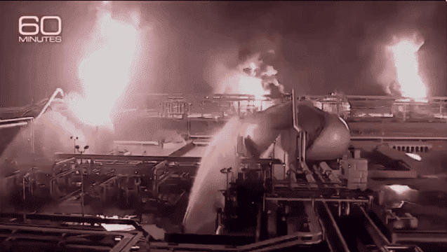 وعرض برنامج "60 دقيقة"، وهو برنامج استقصائي يُبث على قناة "CBS" الأمريكية، لحظات توضح اللحظات الأولى لقصف منشآت النفط السعودية، حيث أظهرت اللقطات الانفجارات التي رافقت القصف.