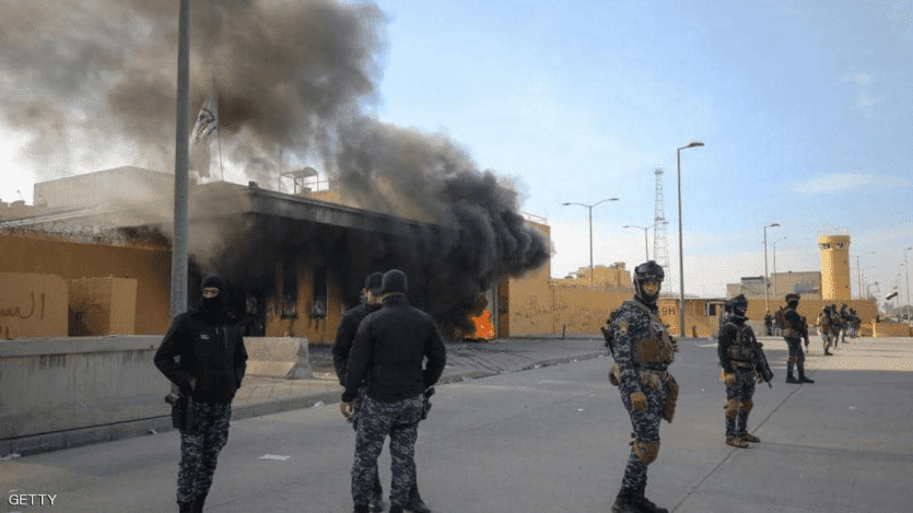 وأفادت وكالة "سبوتنيك"، بان "متظاهرين قاموا بحرق الإطارات أمام السفارة الأميركية في بغداد"، وأن "القوات الأميركية ردت بقنابل الغاز المسيل للدموع اطلقتها من داخل السفارة".