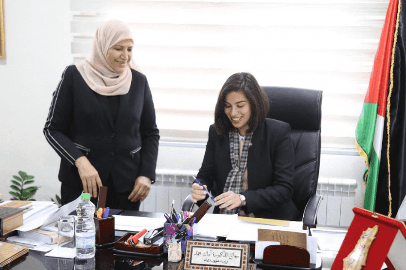 تولت اليوم الشابة الطالبة في جامعة فلسطين التقنية خضوري سوار عواد وزيرة شؤون المرأة الشاب لمدة يوم واحد، وذلك ضمن فعاليات برنامج تميز في موسمه الخامس، وذلك بحضور رئيسة مجلس إدارة منتدى شارك الشبابي رتيبة ابو غوش، بالشراكة مع صندوق الأمم المتحدة للسكان.