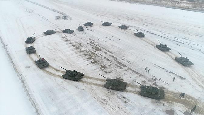 ففي مشاهد بثتها وزارة الدفاع الروسية تظهر 16 دبابة من طراز "تي-72بي 3" وهي تشكل قلبا وسط الثلوج في قاعدة ألابينو العسكرية قرب موكسو.
