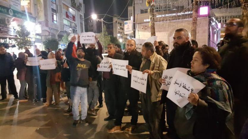 شارك عشرات المواطنين والنشطاء، مساء الإثنين، في مسيرة مناهضة للتطبيع على دوار المنارة وسط رام الله.