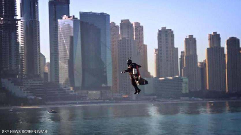 وكان ريفيت يرتدي جناحين من ألياف الكربون، مزوّدين بأربعة محركات نفّاثة صغيرة.