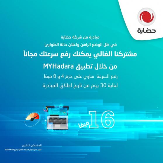 وفي ذات السياق قامت حضارة بإطلاق مبادرة ثانية لرفع سرعات المشتركين من هم ضمن فئات 4 و8 ميجا ورفعها الى 16 ميجا مجاناً لمدة 30 يوم ، وعن كيفية رفع السرعة في ظل هذه الظروف فقد طورت الشركة خاصية تفعيل الخدمة مباشرة من خلال تطبيق myhadara او صفحتي على الموقع الالكتروني http://my.hadara.ps/ حرصاً على سلامة المواطنين ولضمان تقديم أفضل خدمة بشكل امن .