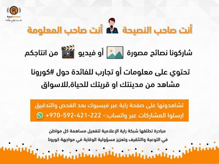 أطلقت شبكة راية الإعلامية مبادرة تحت عنوان "أنت صاحب النصيحة..أنت صاحب المعلومة" لتفعيل مساهمة المواطنين في التوعية والتثقيف، وتعزيز المسؤولية الملقاة على عاتقهم في مواجهة فيروس كورونا.