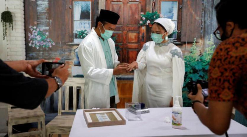 كان العروسان الإندونيسيان محمد نورجامان وأوجي ليستاري ويديا بهري يترقبان زفافهما بوصفه أهم يوم في حياتهما يحتفلان به أمام مئات من المدعوين السعداء، ولكن جائحة فيروس كورونا فرضت تغييرا لخططهما فبدلا من ذلك عقد العروسان قرانهما يوم الجمعة في حفل لم يحضره سوى ثمانية من أفراد الأسرة القريبين. وتابع باقي الأقارب مراسم الزواج التي استغرقت 40 دقيقة على الهواء عبر الانترنت من منازلهم.