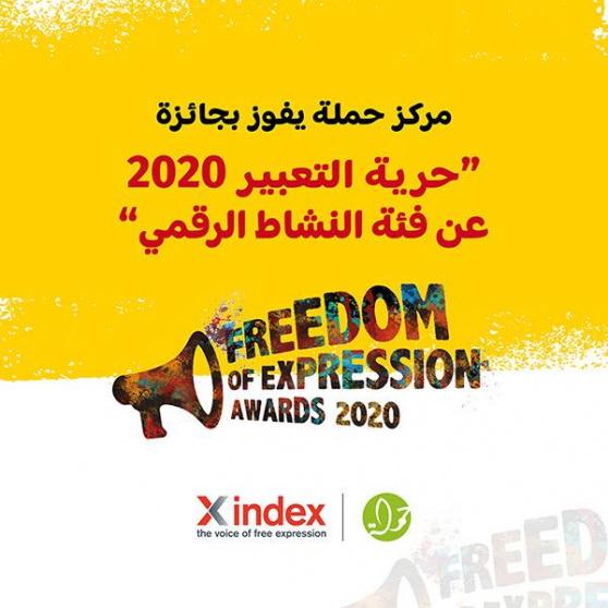 أعلنت لجنة التحكيم في Index on Censorship عن فوز حملة- المركز العربي لتطوير الإعلام الاجتماعي بجائزة "حرية التعبير" عن فئة النشاط الرقمي للعام 2020 على مستوى العالم، وكان من المفترض أن يتسلم مركز "حملة" الجائزة خلال الحفل الذي تَخَطط انعقاده في نهاية هذا الشهر في لندن، إلا أن أزمة الكورونا العالمية حالت بإلغاء الحفل وتحويل فعاليته إلى نسخة رقمية.