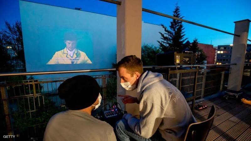 وتمثل الحل الذي تم التوصل إليه، ومن دون التعرض لاحتمال الإصابة بمرض كوفيد-19، في عرض أفلام على جدران باحات المباني.