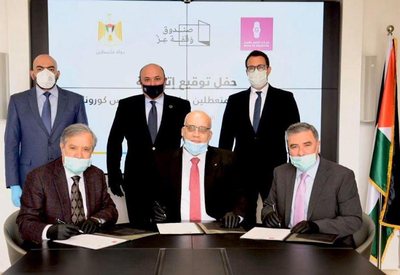ووقع بنك فلسطين ووزارة العمل وصندوق "وقفة عز" اتفاقية لمد يد العون للعمال الفلسطينيين المتعطلين عن العمل جراء أزمة تفشي فيروس كورونا والمسجلين لدى وزارة العمل في جميع محافظات الوطن. وذلك في مقر المركز الرئيسي للإدارة العامة لبنك فلسطين في مدينة رام الله بحضور كل من الدكتور نصري أبو جيش وزير العمل، والسيد عزام الشوا، محافظ سلطة النقد الفلسطينية، والسيد هاشم الشوا، رئيس مجلس إدارة مجموعة بنك فلسطين، والسيد طلال ناصر الدين، رئيس صندوق وقفة عز، والسيد رشدي الغلاييني مدير عام بنك فلسطين، والسيد رامي مهداوي مدير عام الإدارة العامة للتشغيل في وزارة العمل.