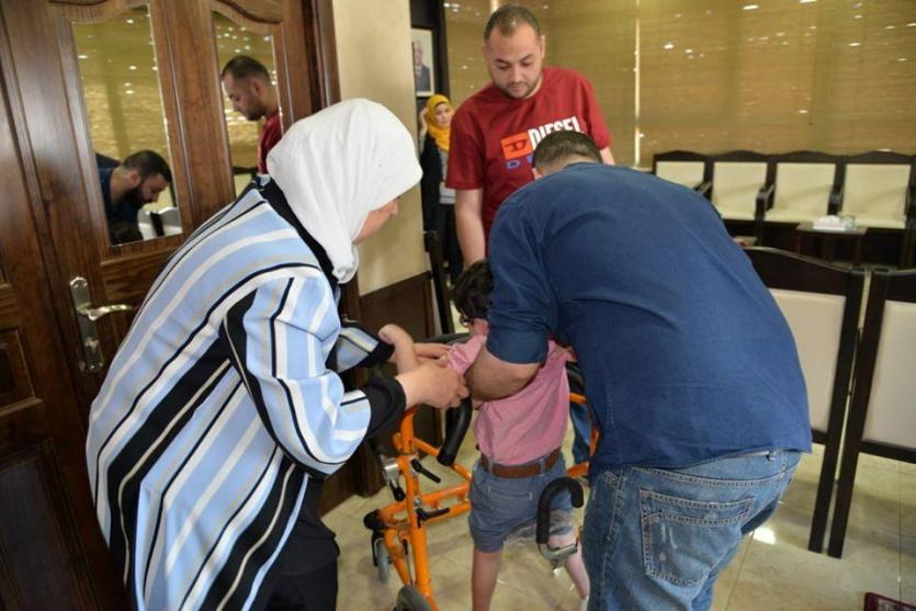 غنام تسلم طفل من ذوي الاحتياجات الخاصة جهازاً لمساعدته على الحركة