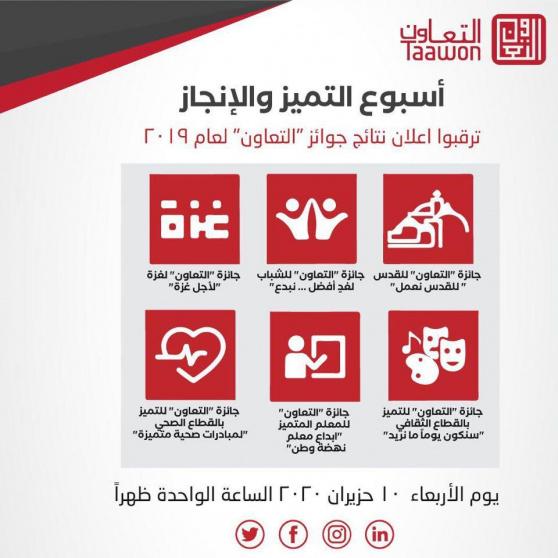 أطلقت مؤسسة التعاون، اليوم السبت، "أسبوع التميز والانجاز" للتعريف بالمؤسسات والأفراد الذين وصلوا للمرحلة النهائية من المنافسة على "جوائز التعاون لعام 2019"، التي سيتم الإعلان عن الفائزين فيها يوم الأربعاء المقبل 10 حزيران الجاري، عبر البث المباشر على وسائل التواصل الاجتماعي.
