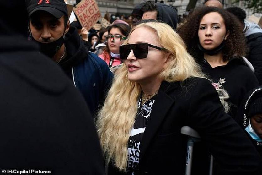 وهتفت مادونا مع آلاف المتظاهرين "لا عدالة، ولا سلام"، في شوارع لندن، الأحد، في دعم لحركة Black Lives Matter، الشهيرة، ورفعوا لافتات ضد العنصرية.