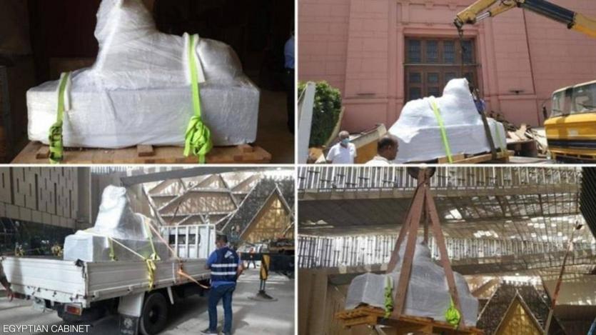 استقبل المتحف المصري الكبير الذي يتم تشييده حاليا قطع أثرية ضخمة قادمة من المتحف المصري بميدان التحرير بالقاهرة تمهيدا لعرضها على الدرج العظيم ضمن سيناريو العرض المتحفي الخاص بالمتحف المقرر افتتاحه العام المقبل.