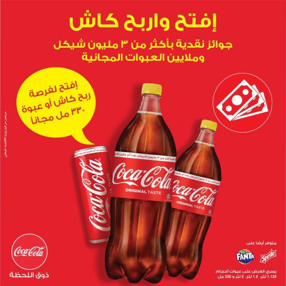 أطلقت شركة المشروبات الوطنية كوكاكولا/كابي حملة "افتح واربح" والتي تمنح الفرصة لربح العديد من الجوائز وتشمل جوائز نقدية تبلغ قيمتها الإجمالية أكثر من 3 مليون شيكل، بالإضافة إلى ملايين العبوات المجانية من حجم 330 مليلتر.