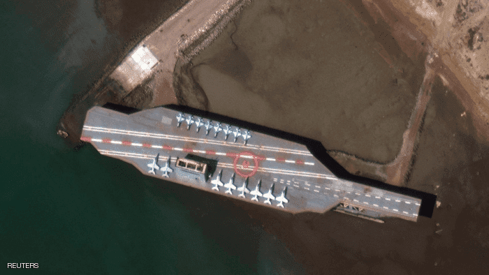 وأظهرت اللقطات نموذجا لحاملة الطائرات الأميركية من فئة "نيميتز" بوجود صفوف من مجسمات طائرات مقاتلة على جانبي مدرج الهبوط.