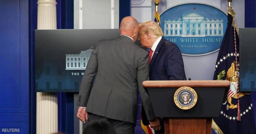 قطع الرئيس الأميركي دونالد ترامب، مساء يوم امس الاثنين، مؤتمره الصحفي حول فيروس كورونا وخرج وسط حراسة من عناصر الأمن بشكل مفاجئ، بعد سماع أصوات طلقات نارية بالقرب من أبواب البيت الأبيض الخارجية.