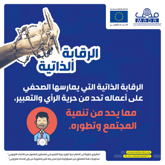 أطلق المركز الفلسطيني للتنمية والحريات الاعلامية "مدى" حملة اعلامية للحد من الرقابة الذاتية في الاعلام والتي يمارسها الصحفيون ووسائل الاعلام على أنفسهم وعلى إنتاجهم الاعلامي والصحفي، وذلك ضمن مشروع "خطوة إلى الأمام نحو تعزيز حرية التعبير في فلسطين" الممول من الإتحاد الأوروبي.