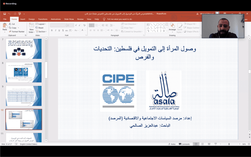 عقدت الجمعية الفلسطينية لصاحبات الأعمال – أصالة، امس الاثنين جلسة عرض ونقاش لورقة سياسات تحت عنوان "وصول المرأة إلى التمويل في فلسطين: التحديات والفرص"، بالتعاون مع مركز المشروعات الدولية الخاصة CIPE، عبر تطبيقzoom .
