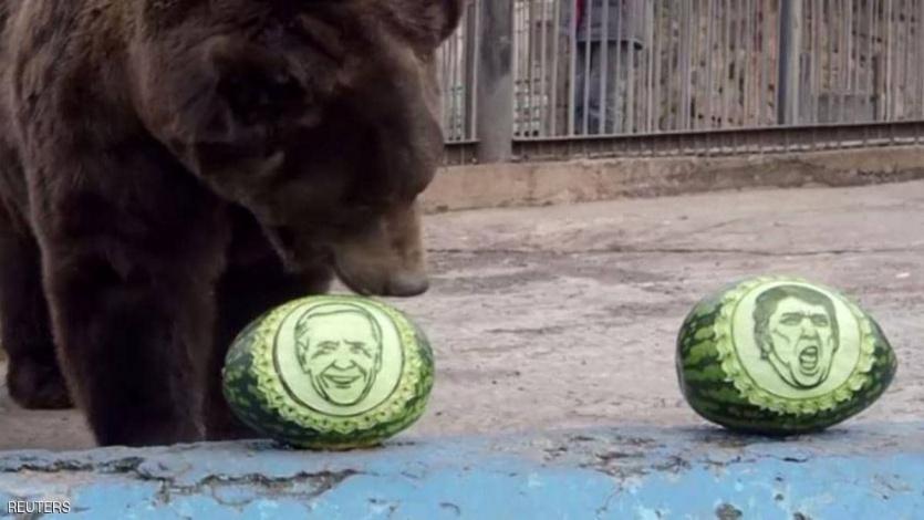 وتفحص الدب بويان بعناية بطيختين رسم على كل واحدة منهما وجه المرشحين للرئاسة الأميركية، وذلك في حديقة حيوان روييف روشى في مدينة كراسنويارسك السيبيرية، وفق ما ذكرت رويترز.