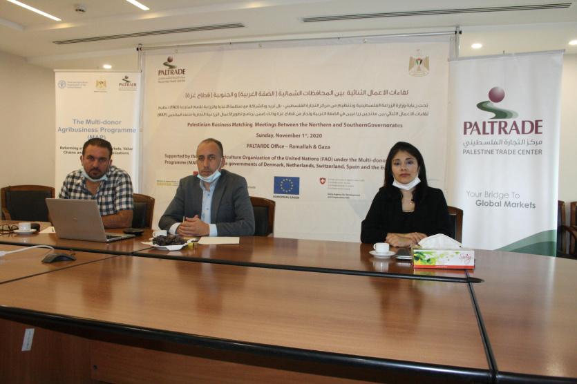 عقد مركز التجارة الفلسطيني "بال تريد" بالتعاون مع وزارة الزراعة الفلسطينية، وبتمويل من مكتب منظمة الأغذية والزراعة للأمم المتحدة "الفاو"، لقاءات الأعمال الثنائية بين المحافظات الشمالية "الضفة الغربية" والمحافظات الجنوبية "قطاع غزة"، التي استمرت على مدار الأسبوع الماضي، لتكون بمثابة حلقة وصل للمزارعين والموردين، والتجار في شقي الوطن، بهدف تعزيز الحركة التجارية والتبادل التجاري الداخلي.