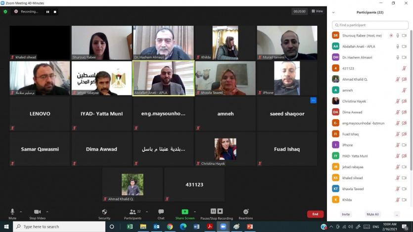 وقد تم تنظيم ورشة العمل هذه عبر تقنية "زووم" بمشاركة وحضور عضو الهيئة التنفيذية للاتحاد رئيس بلدية قلقيلية د. هاشم المصري، والمدير التنفيذي للاتحاد م. عبدالله عناتي، وممثل عن وزارة الحكم المحلي م. جهاد ربايعة، ومنسق منصة الهندسة والتخطيط م. مراد التميمي، بالإضافة إلى ممثلين عن الهيئات المحلية وأعضاء منصة الهندسة.