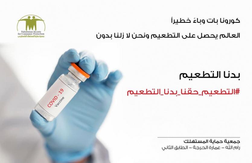 اطلقت جمعية حماية المستهلك الفلسطيني في محافظة رام الله والبيرة حملة (التطعيم حقنا بدنا التطعيم) للضغط والتأثير على جهات الاختصاص الحكومية من أجل توفير التطعيم ضد كورونا لكل المواطنين الفلسطينين، والاعلان عن شفافية الإجراءات من حيث المستحقين ومن الذين تلقوا التطعيم والضغط على نموذج تعبئة البيانات للوصول الى احقية التطعيم.