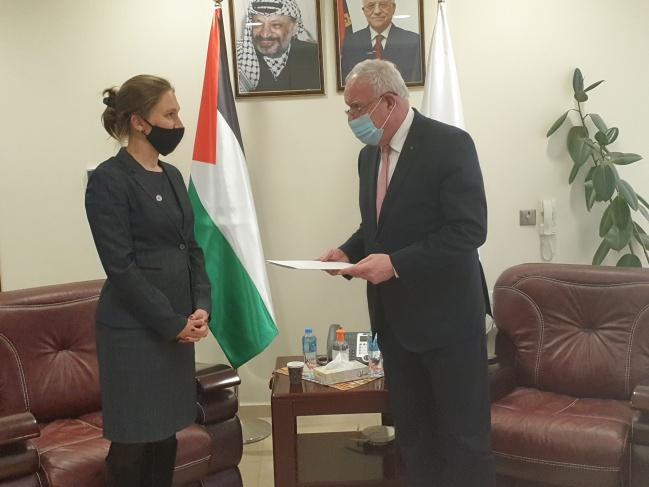 تسلم وزير الخارجية والمغتربين رياض المالكي نسخة من أوراق تعيين ممثلة الصليب الأحمر إليس دوبوف لدى دولة فلسطين.