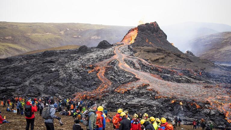 جذب ثوران بركان خامد منذ فترة طويلة جنوب غربي أيسلندا، حشودا من الزوار للحصول على نظرة من قرب للحمم السائلة.