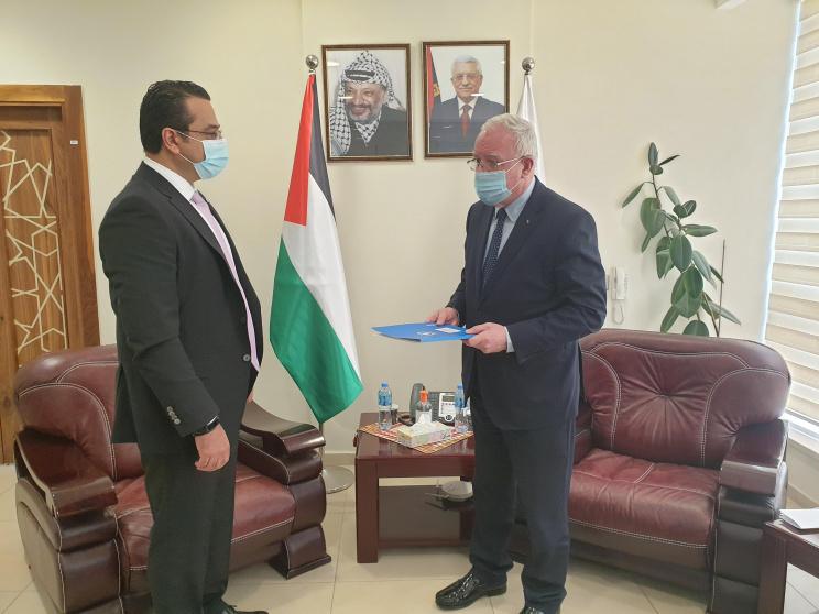 تسلم وزير الخارجية والمغتربين رياض المالكي، نسخة من أوراق تعيين ممثل برنامج الأغذية العالمي سامر عبد الجابر لدى دولة فلسطين.