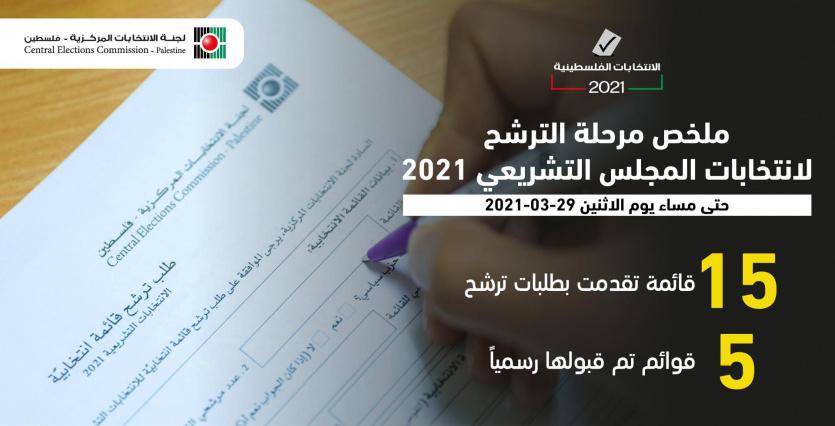 أعلنت لجنة الانتخابات المركزية أن العدد الكلي لطلبات الترشح المقدمة منذ بداية عملية الترشح وحتى نهاية دوام اليوم الاثنين بلغ (15) قائمة انتخابية، للتنافس في انتخابات المجلس التشريعي 2021.