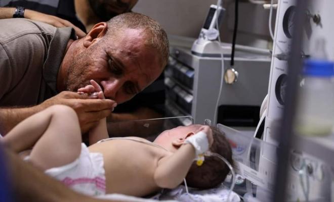 تمكن المواطن محمد الحديدي من رؤية ومشاهدة طفله الناجي الوحيد من مجزرة الشاطئ صباح اليوم السبت، مجمع الشفاء الطبي غرب مدينة غزة.